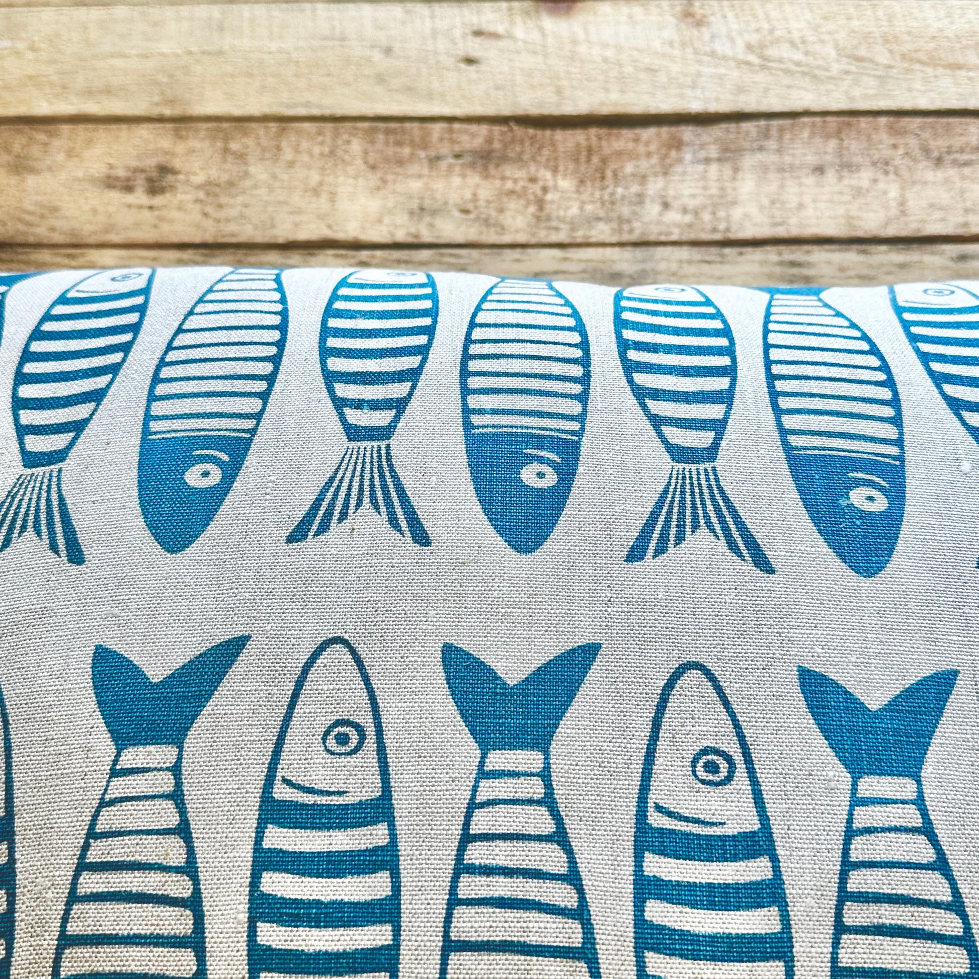 There’s plenty of stripey fish on this cushion. Handprinted in my studio in Bembridge Harbour in Smoke Blue on Beautiful Irish Linen.