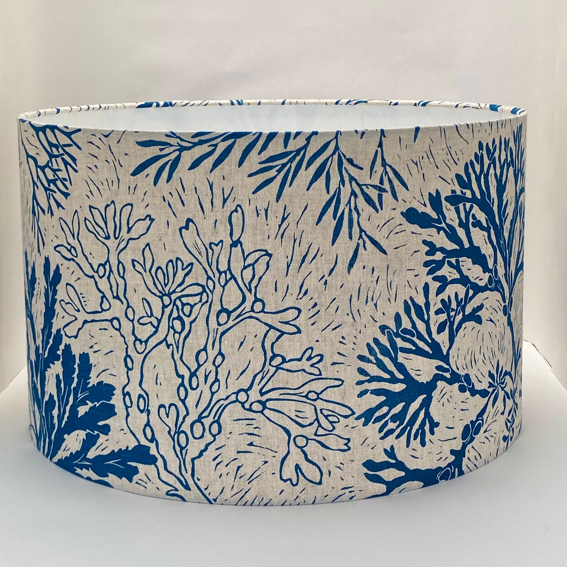 The Seashore design is inspired by seaweed I collected on Bembridge Beach, here on the Isle of Wight. The design was created from one large Lino block print which wraps the pattern around the shade.